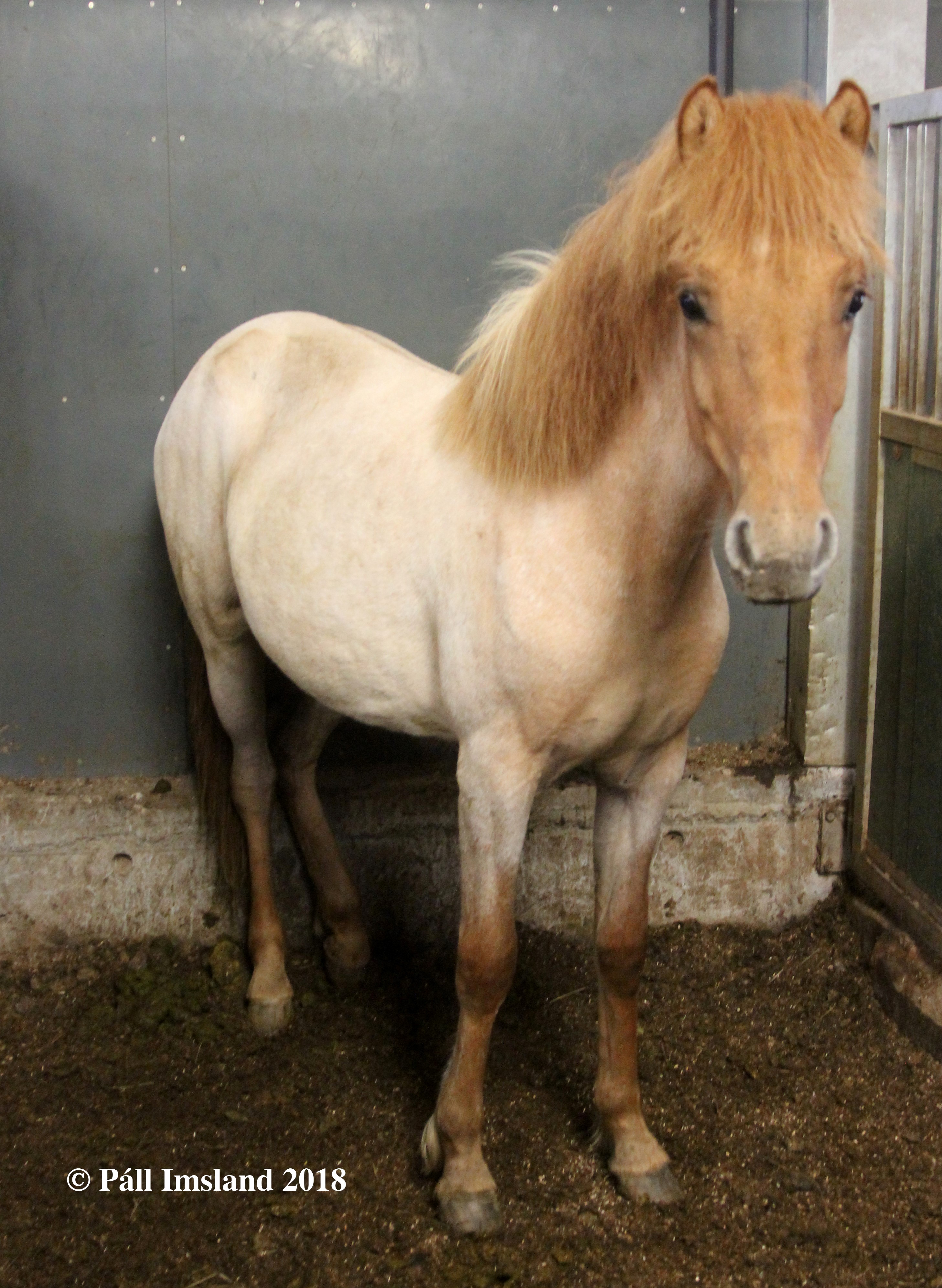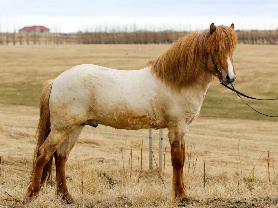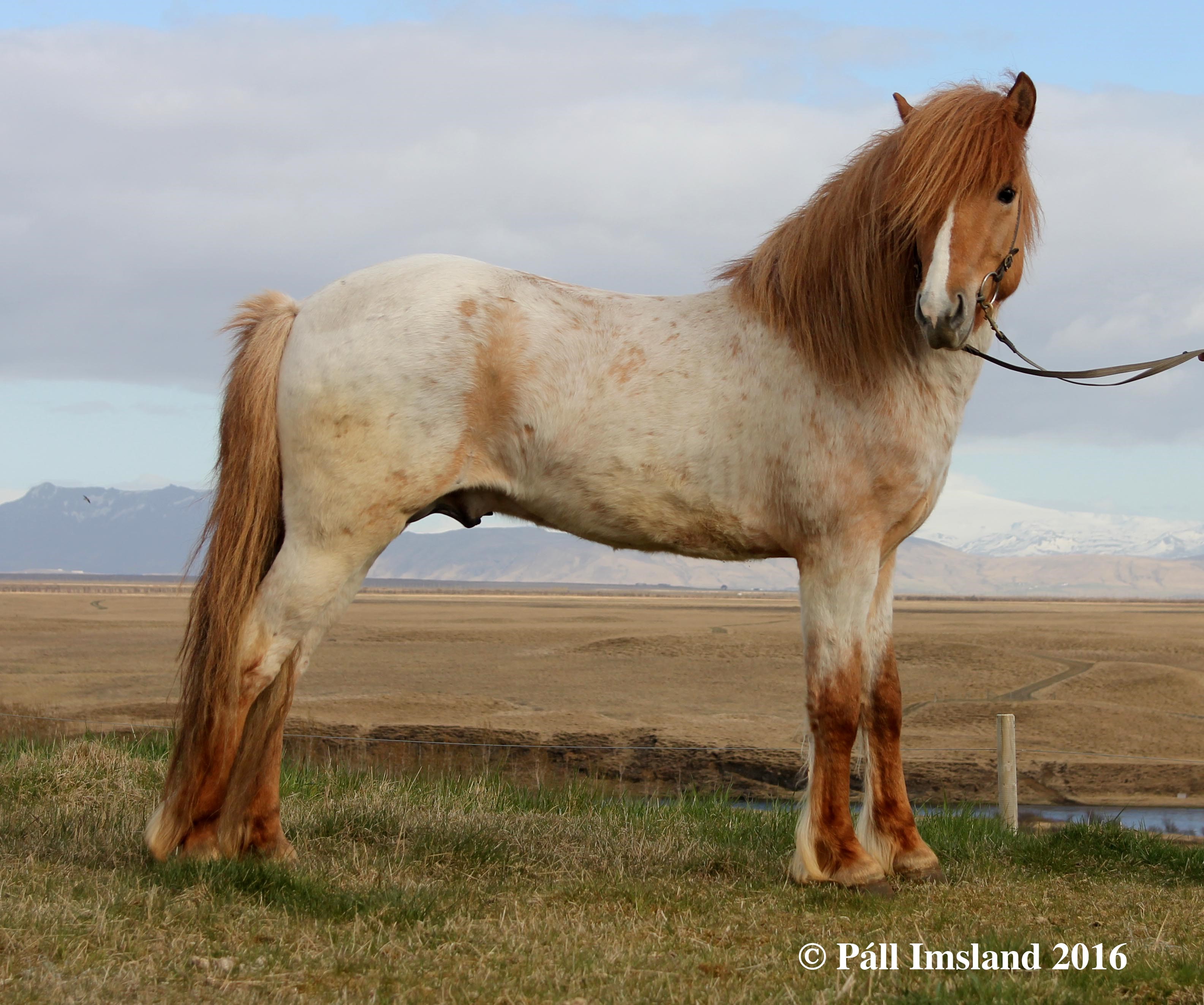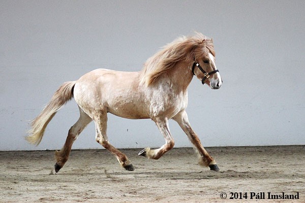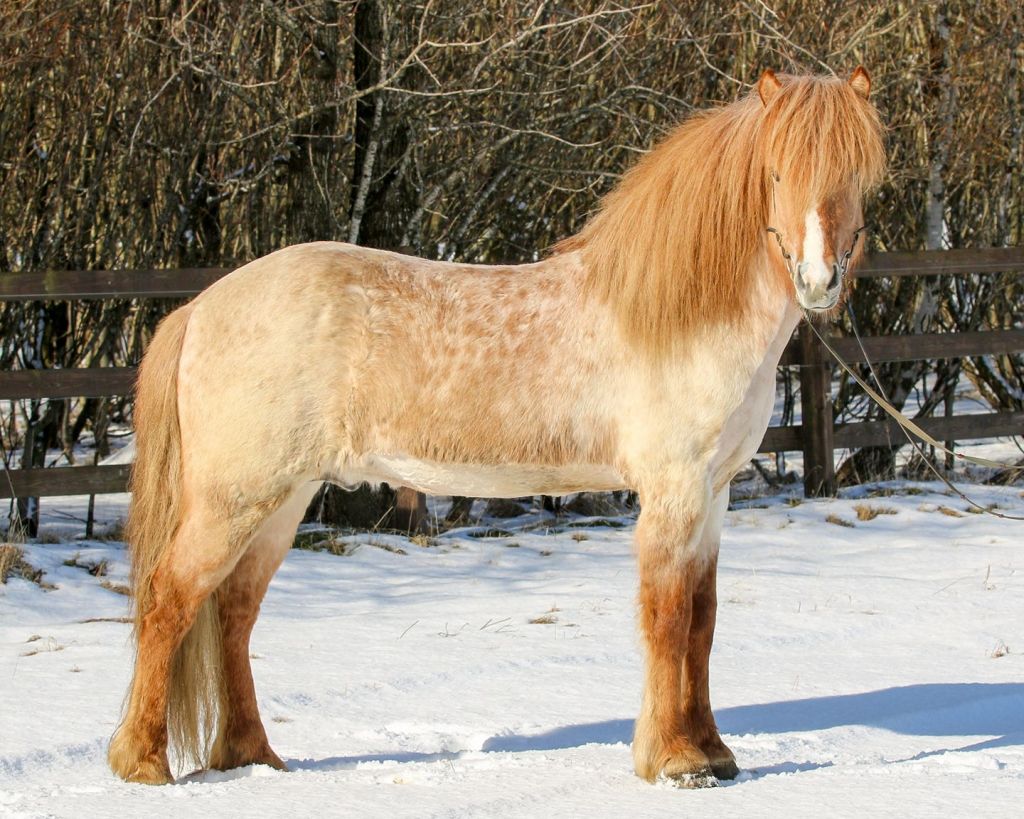 Moli has received 1. price for conformation. Moli is a red dun roan with a blaze. He is heterozygous for roan, therefore he has a 50% chance to pass on the roan colour to his offspring, regardless of colour. If he is mated to a roan mare, the chance of a roan foal goes up to 75%. He has in fact given even better results, more than half of his foals are roan. Many of his offspring have stars and blazes.