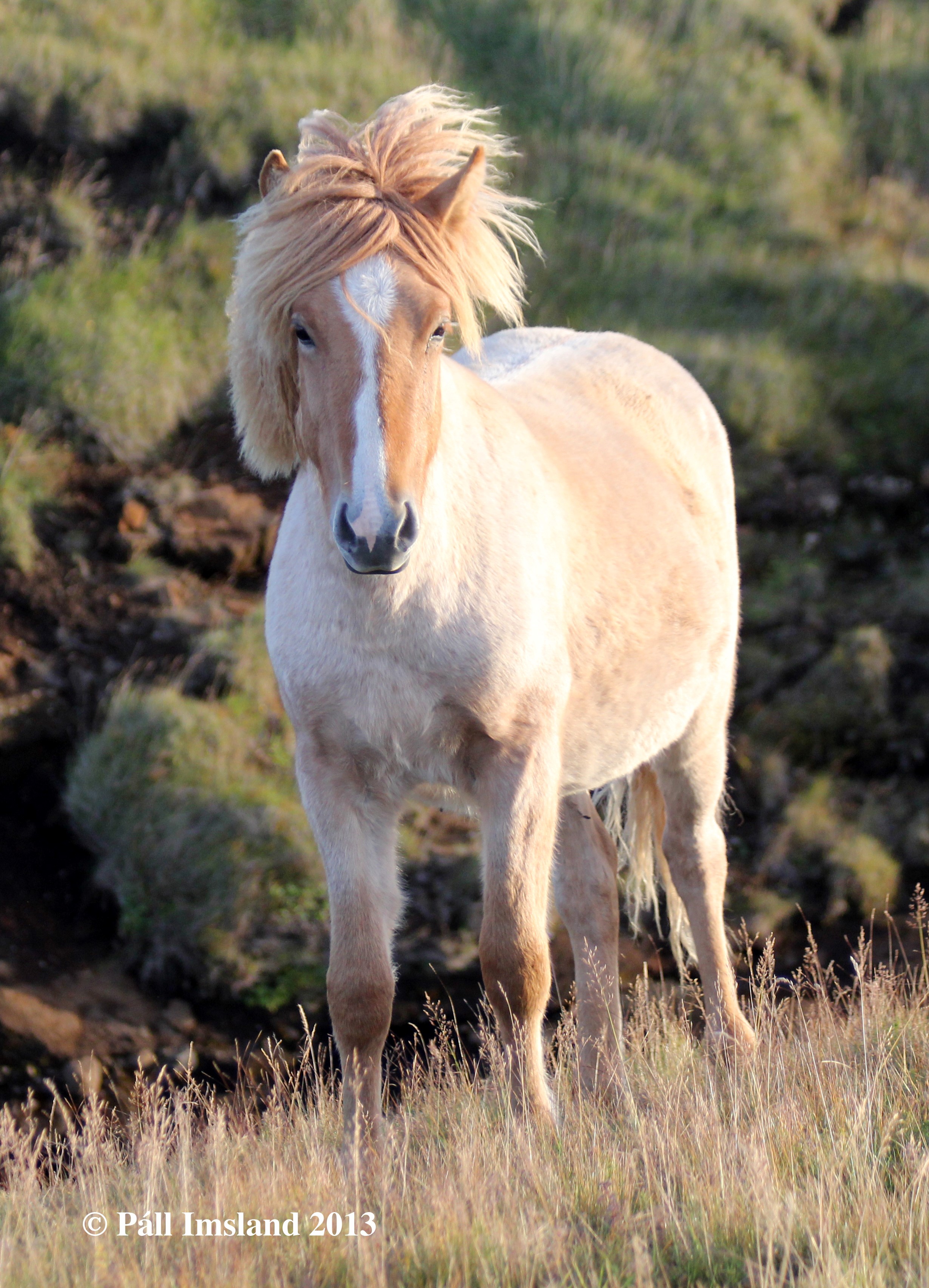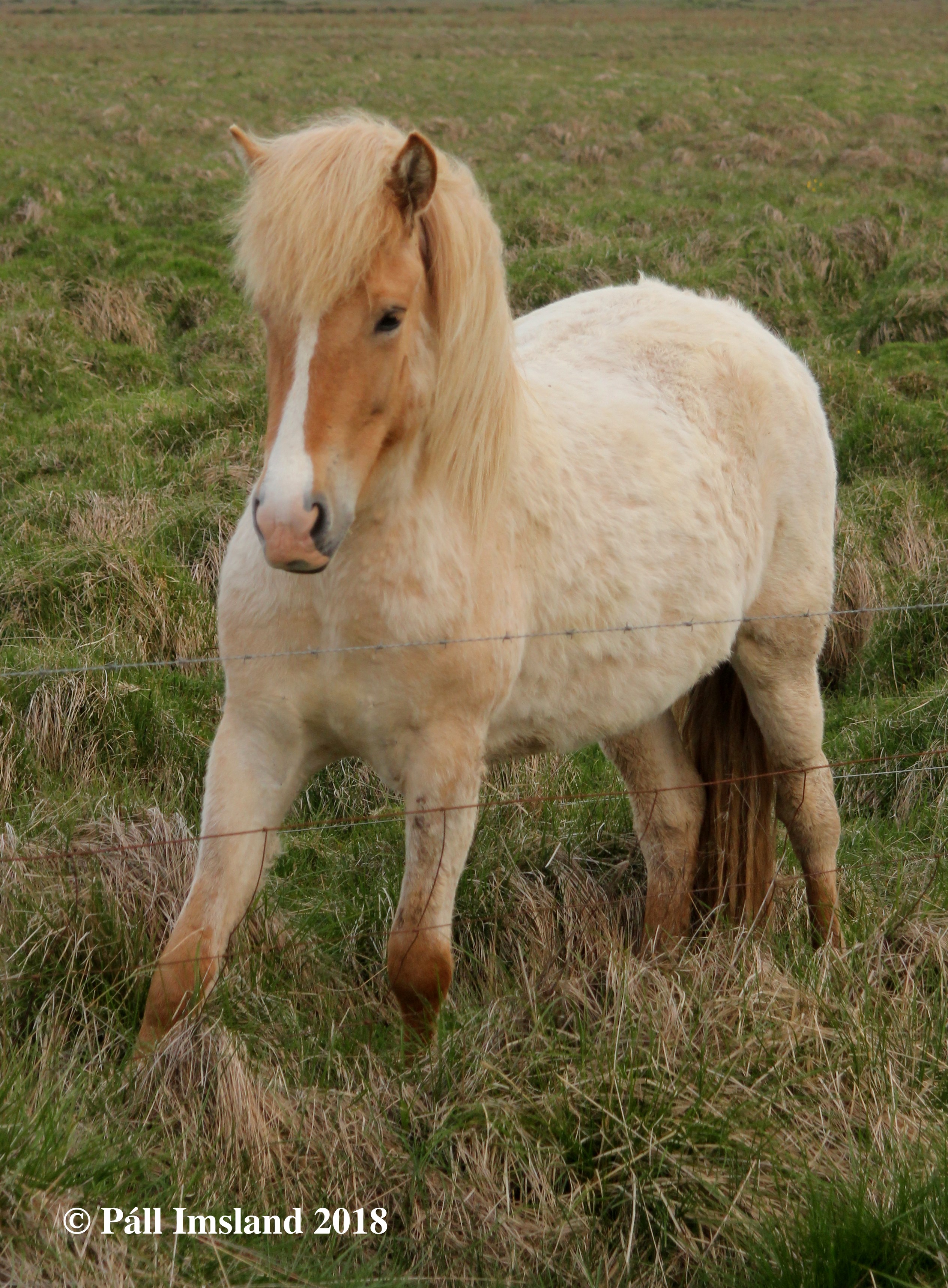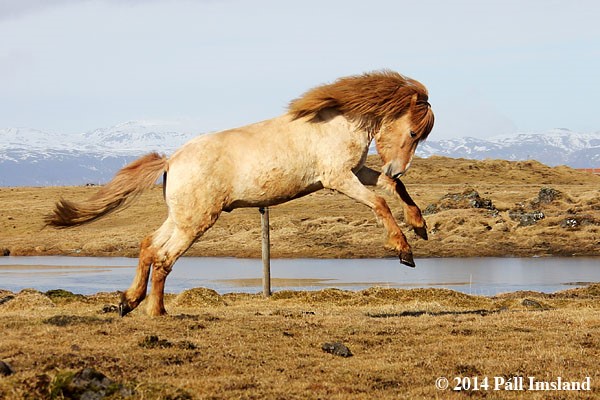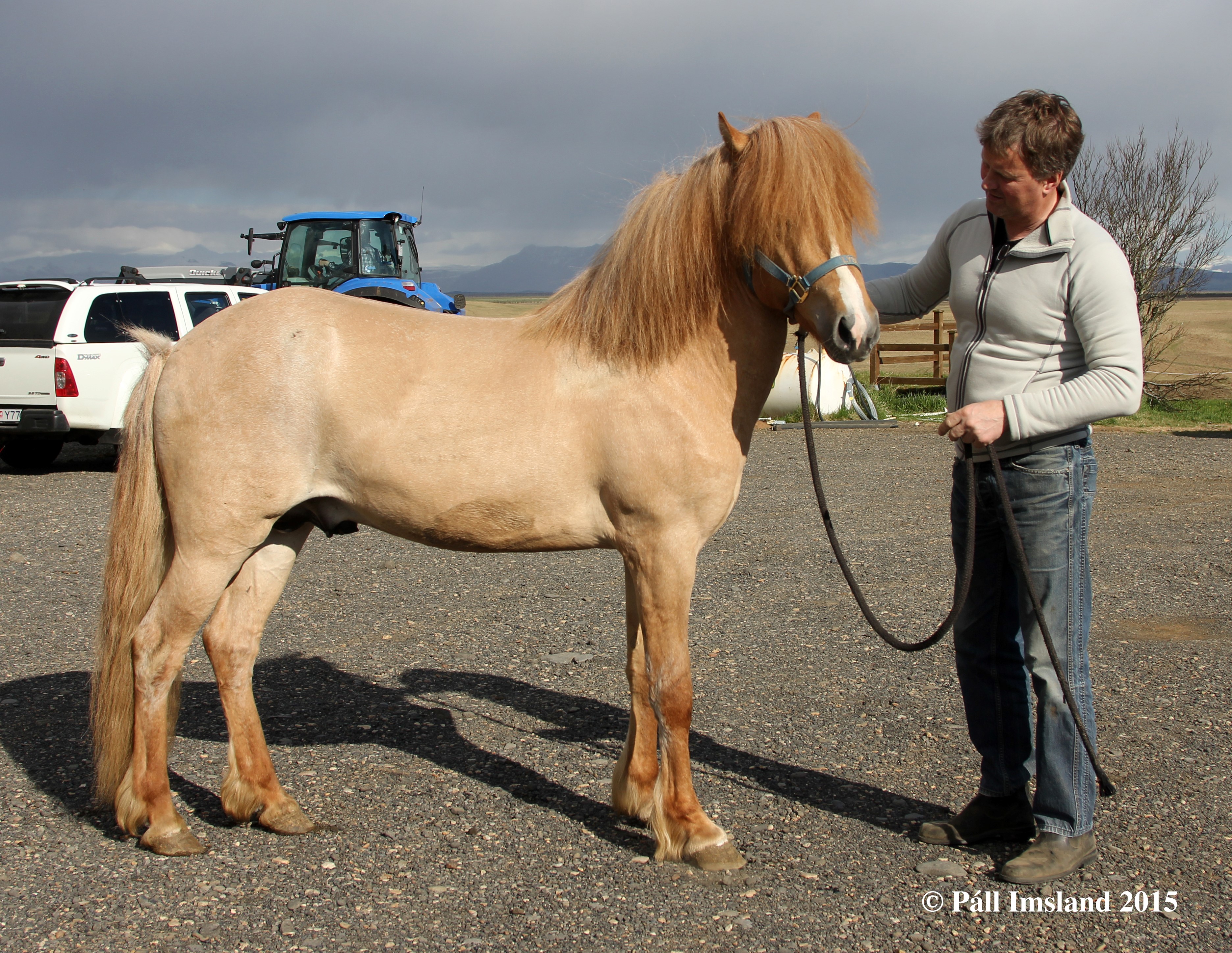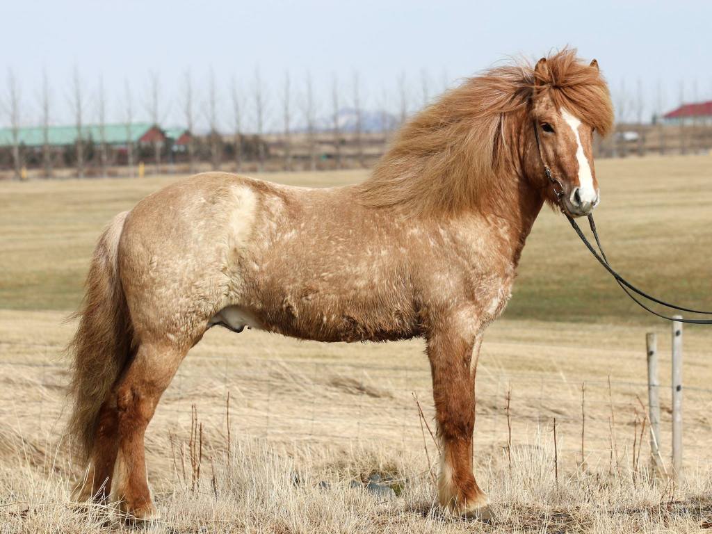 Moli has received 1. price for conformation. Moli is a red dun roan with a blaze. He is heterozygous for roan, therefore he has a 50% chance to pass on the roan colour to his offspring, regardless of colour. If he is mated to a roan mare, the chance of a roan foal goes up to 75%. He has in fact given even better results, more than half of his foals are roan. Many of his offspring have stars and blazes.